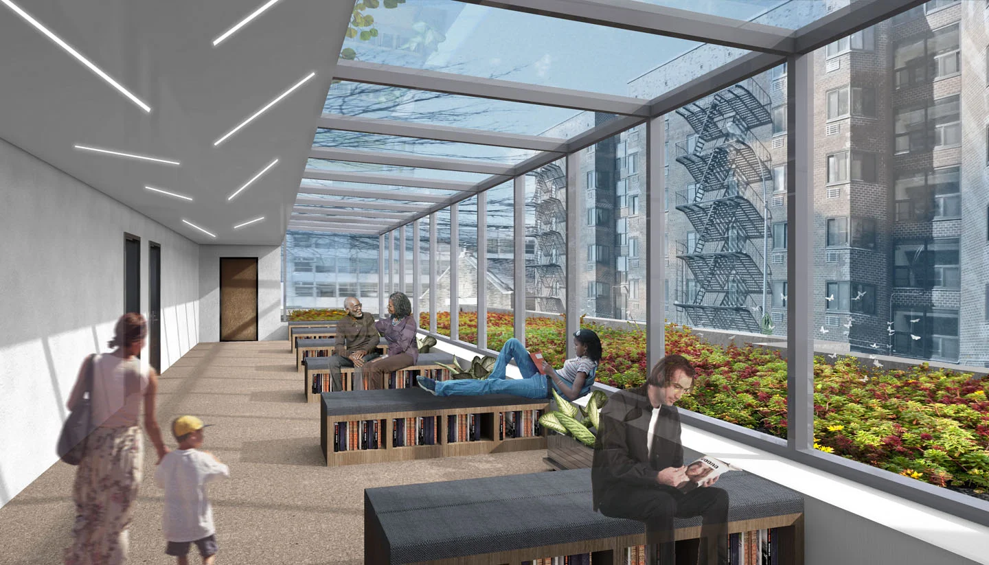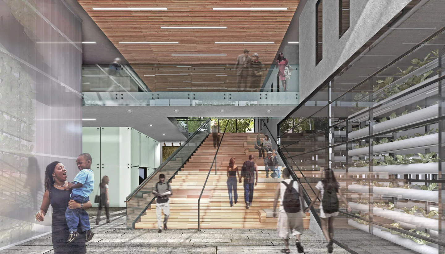 The WELL Building Standard places a large emphasis on healthy and responsible food production and access. The fresh food commercial tenant, landscaped areas on roof setbacks and the urban farm will all support this priority. Near to the stairs alternated on each floor is a wellness lobby. These spaces will be dedicated to specific recreational uses that satisfy the WELL Building Standard such as a library, playroom, computer lab, meditation room/zen garden, gym, greenhouse, and meeting room for health related trainings or groups. The setbacks at the second, seventh and eighth floors provide opportunities for green roofs and more health related shared space. These landscaped outdoor areas will be used for everything from active play to more peaceful, even educational pursuits.