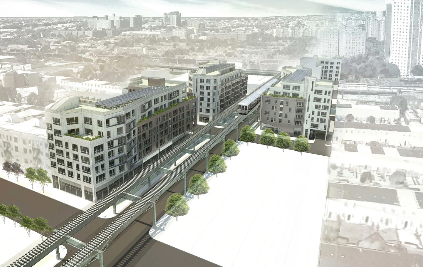 The project design is intended to extend the newly revitalizing Livonia Corridor, with specific consideration given to enhancing both the mixed-use streetscape at ground level and the upper residential floors facing the elevated subway. The new buildings feature tall and open storefronts at the sidewalk level, with facades above that are gently angled to turn apartment windows slightly askew from the train line, creating more privacy options for apartment residents and a varied vista above the track level.